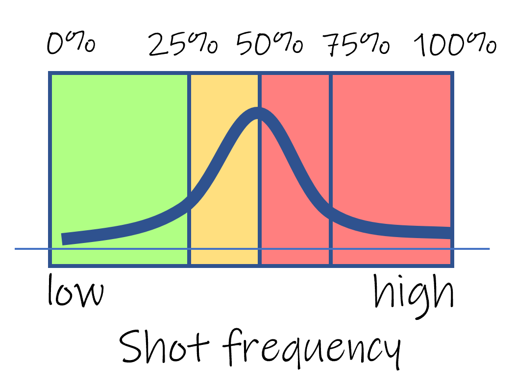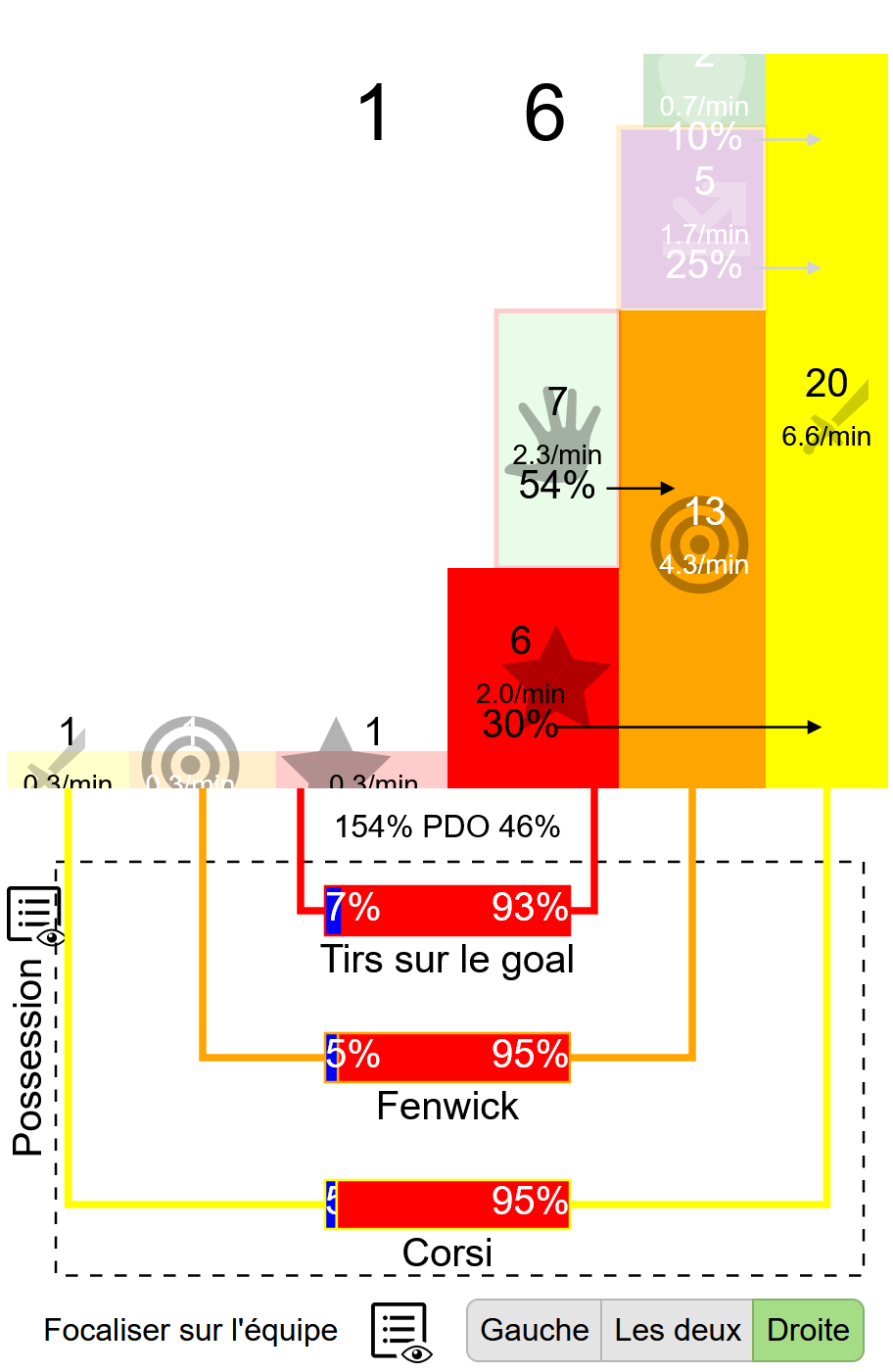 La couleur de la fréquence de tir permet de comparer la fréquence de tir actuelle avec la fréquence de tir de tous les matchs joués précedemment. Le code couleur est le suivant : vert=1er quartile, orange=2ème quartile, rouge=3ème et 4ème quartiles.